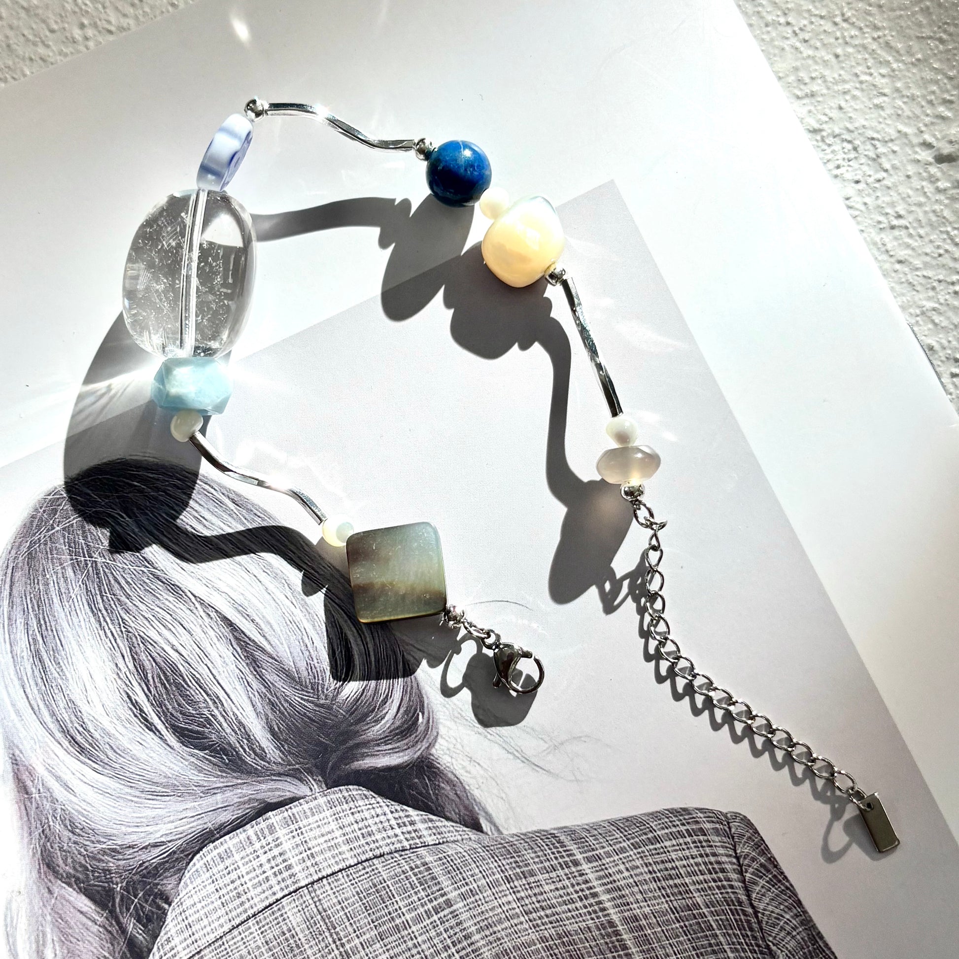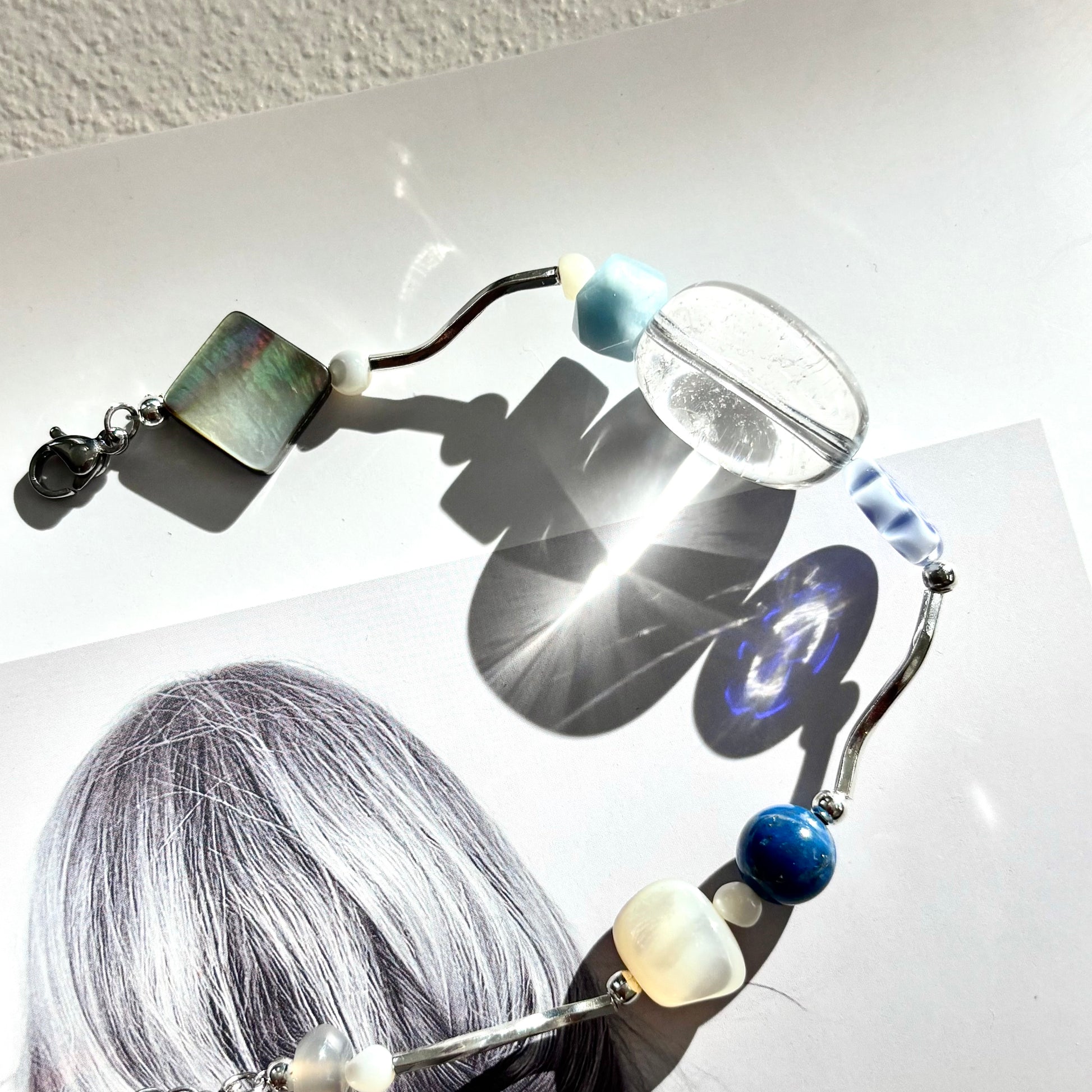 From the ArcLine Collection comes the Crystal Current Bracelet—a flowing composition of clarity, calm, and elemental beauty. At its heart lies a luminous clear quartz center stone, flanked by serene aquamarine, deep blue kyanite, and natural shell accents. The handmade arty clasp and adjustable stainless steel chain add a sculptural, modern finish.