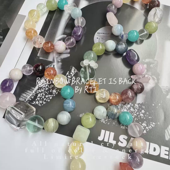 Discover the Rainbow Collection — a luminous series of handmade crystal bracelets designed to reflect light, energy, and individuality. Each piece combines a spectrum of natural gemstones such as clear quartz, rose quartz, citrine, amethyst, amazonite, aquamarine, jade, fluorite, tiger’s eye, kyanite, and kunzite, creating a vibrant harmony of color and intention.