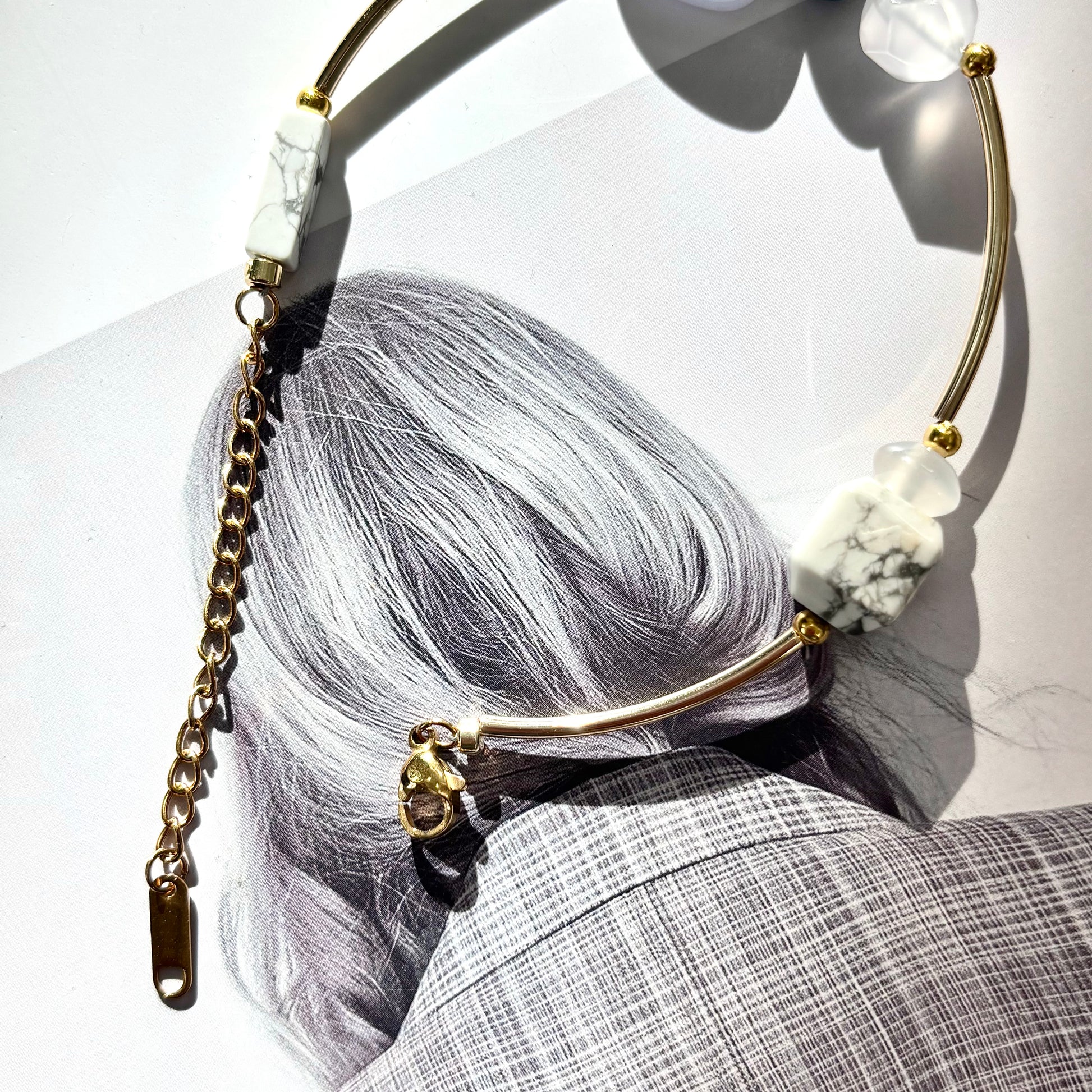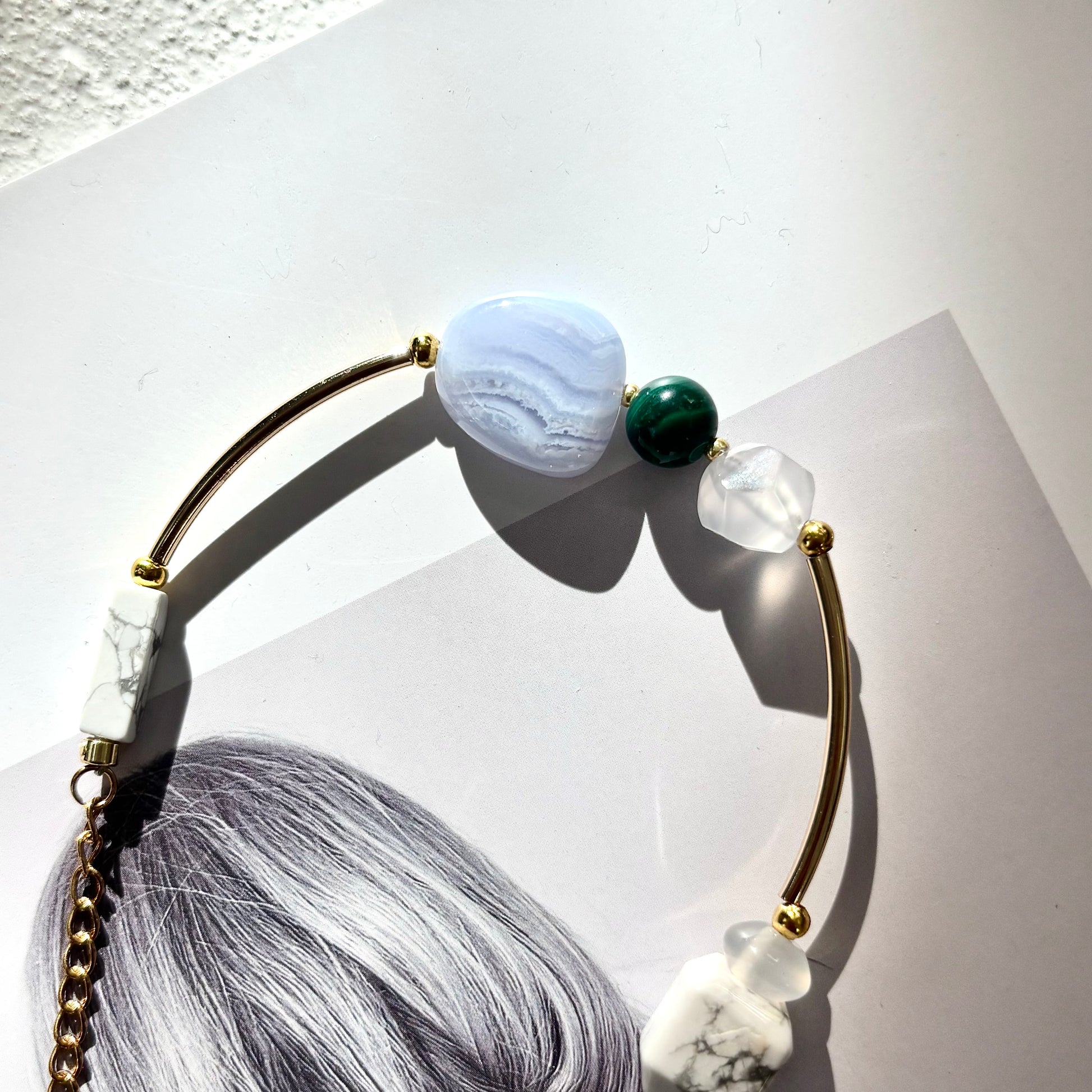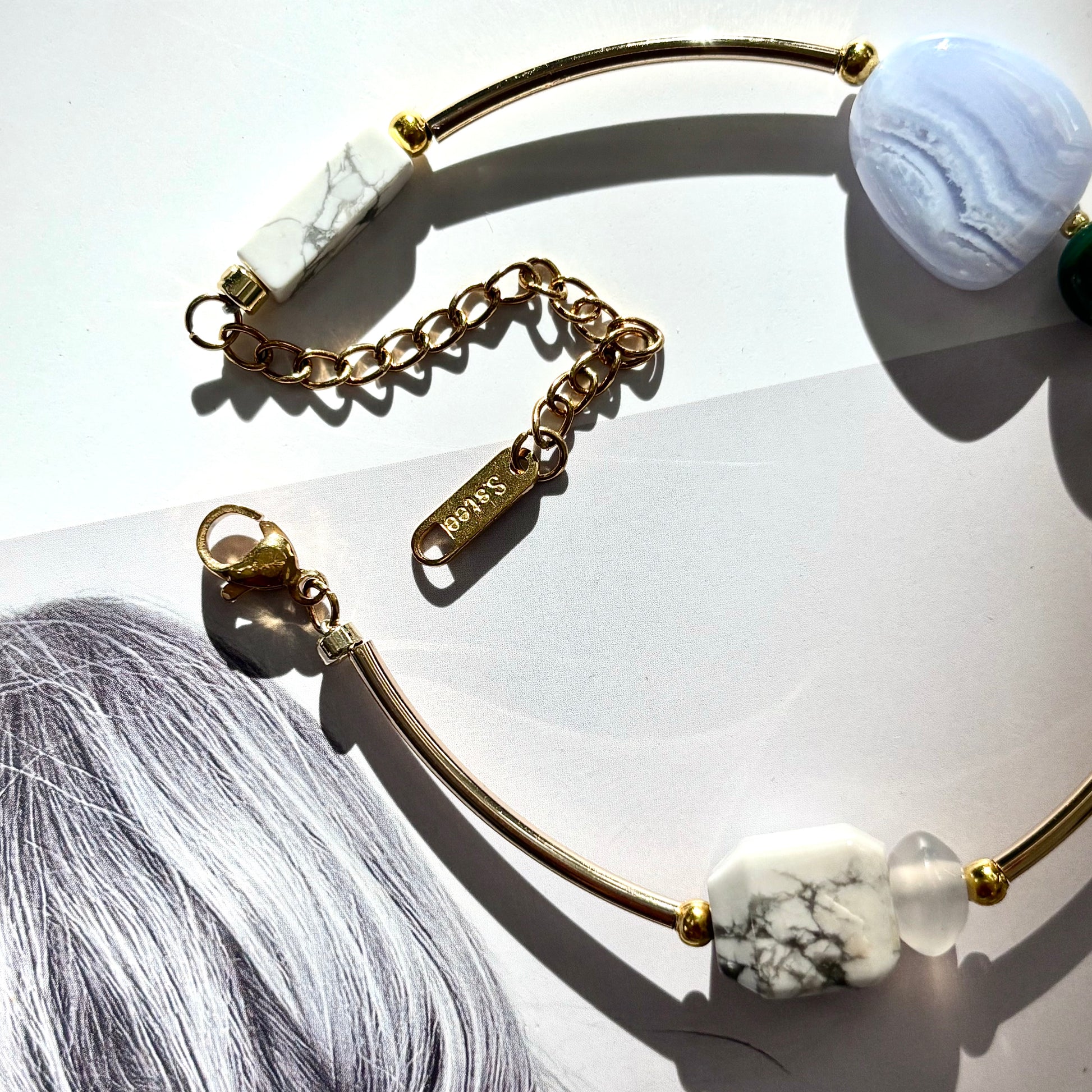 Elegant and versatile, this adjustable chain bracelet features a refined blend of Howlite, Malachite, Chalcedony, and Blue Agate stones, accented with warm gold details. Each gemstone is carefully selected for its natural beauty and energy, creating a harmonious balance of calm, confidence, and clarity.