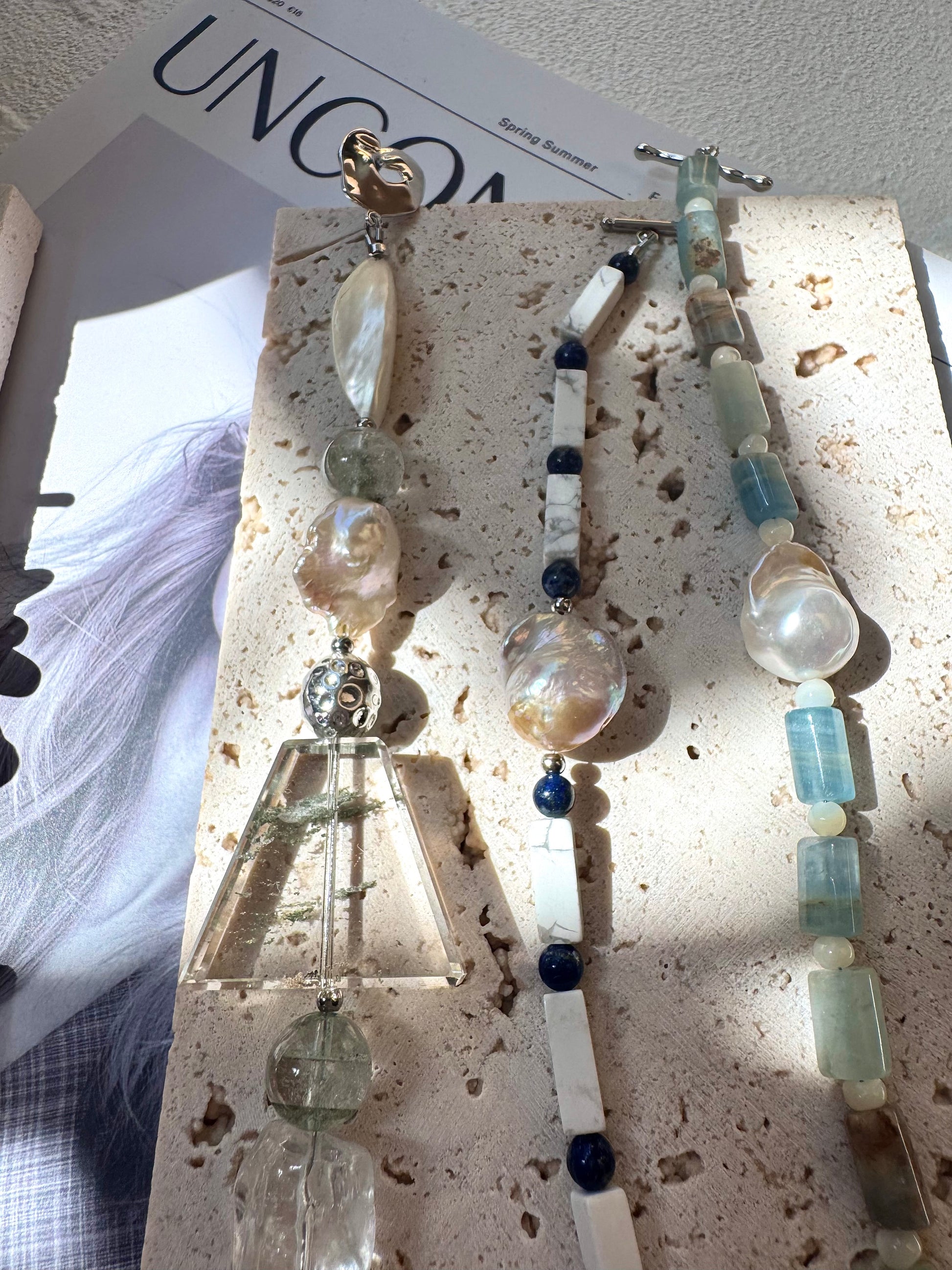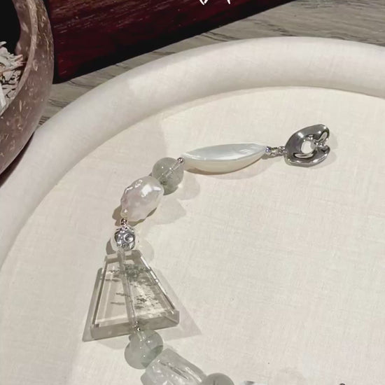 A graceful blend of earthy tones and luminous textures, this bracelet features a curated mix of natural stones—each chosen for its energy and organic form. Green phantom quartz and green quartz bring layered depth, while shell and howlite offer softness and grounding. A baroque pearl adds a touch of elegance, framed by silver-plated toggle and accents for a sculptural finish.