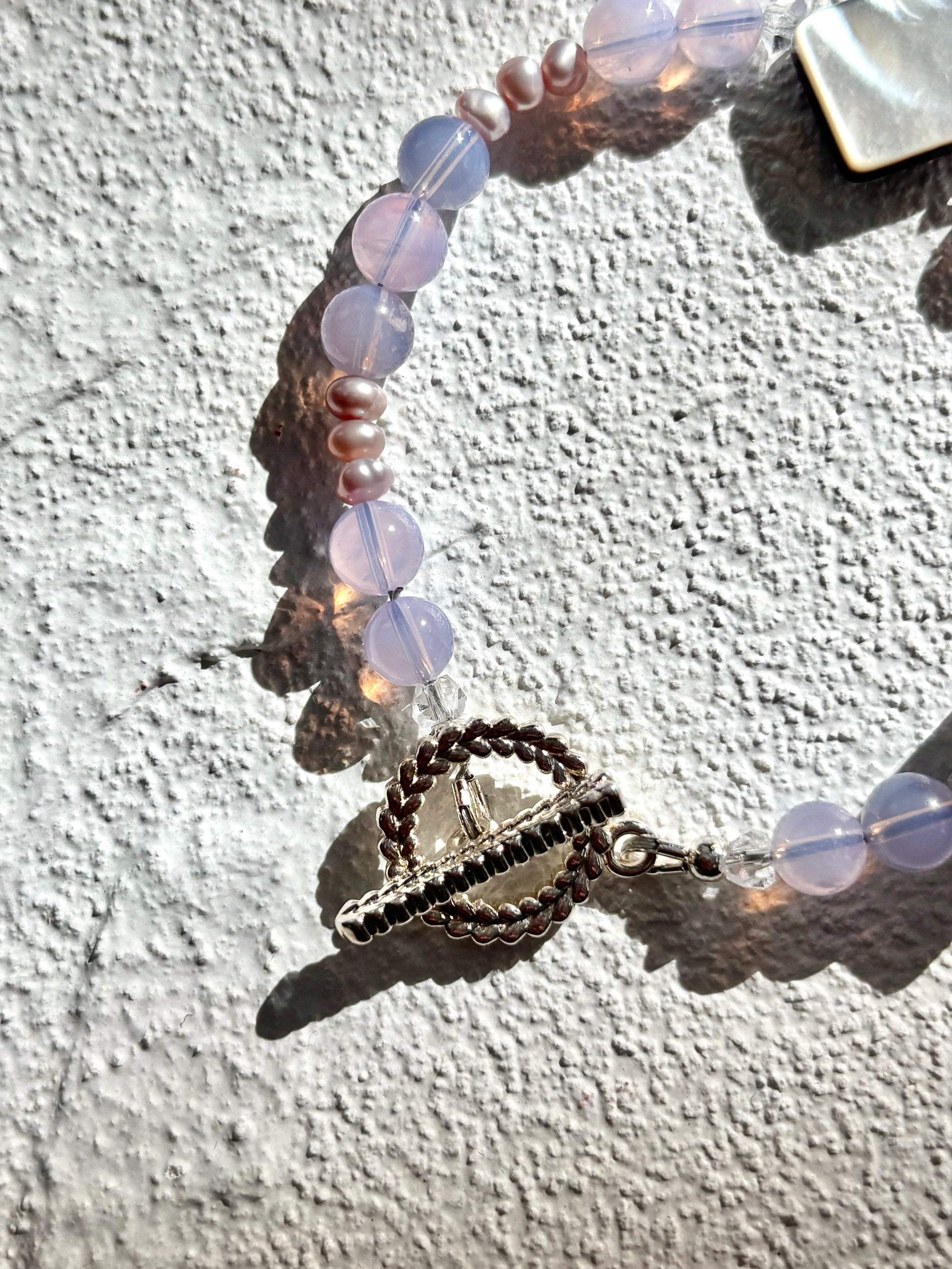 Soft, romantic tones meet natural elegance in this handcrafted bracelet featuring Purple Chalcedony, delicate pink and purple seed pearls, luminous shell accents, and Howlite stones. Finished with a refined silver toggle clasp, this design captures effortless sophistication with a gentle feminine charm.